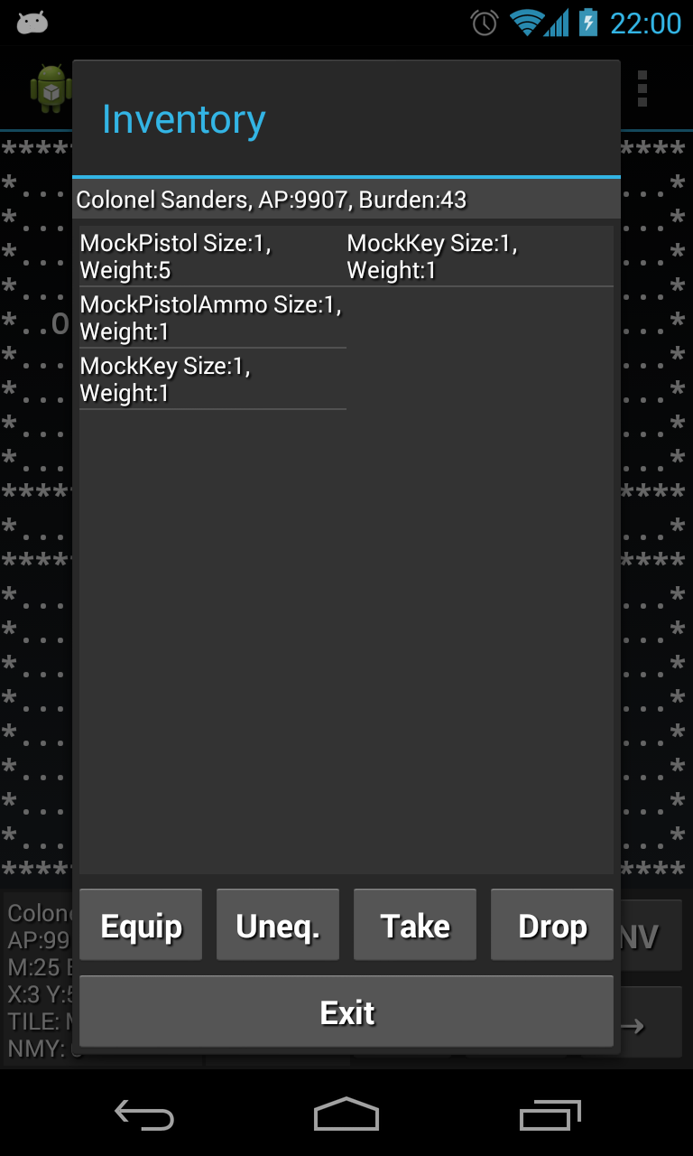 Now, the mechanism that tiles can contain items is working (items laying on the ground), and tiles can also be in a specific state (locked, unlocked, opened, closed). Why not make a tile called, for example, crate (c), and program it that the items are visible only when it’s in the opened state. Again, works like a charm! Now the unit must unlock and open a crate before he can see and take what’s inside. Of course if the unit is over cumbered, items from the inventory can also be placed and locked inside the crate.