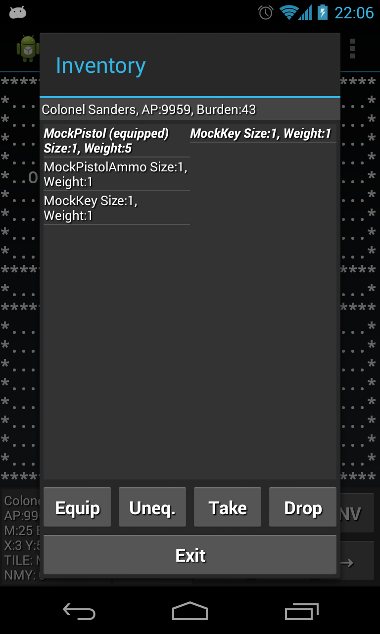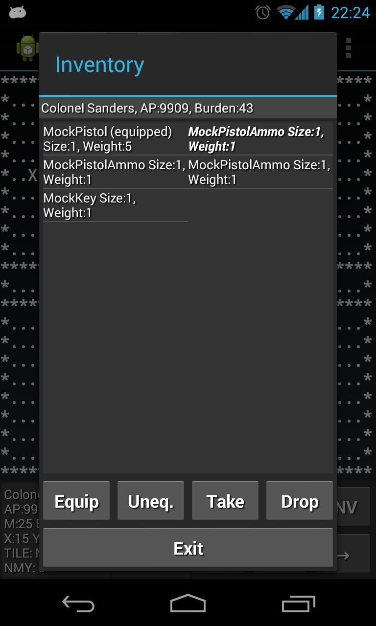 “X” marks the spot! Items are also shown on the map. The simple menu dialog which handled unit’s inventory so far can’t be used anymore for more complex operations. Therefore, I decided to build an inventory dialog which consists of two lists: unit’s current items and items laying on the ground (tile) where the unit is located. The dialog has buttons for all necessary actions: equip / unequip, take / drop items. Info line where current unit AP’s and burden (encumbrance) is also shown.